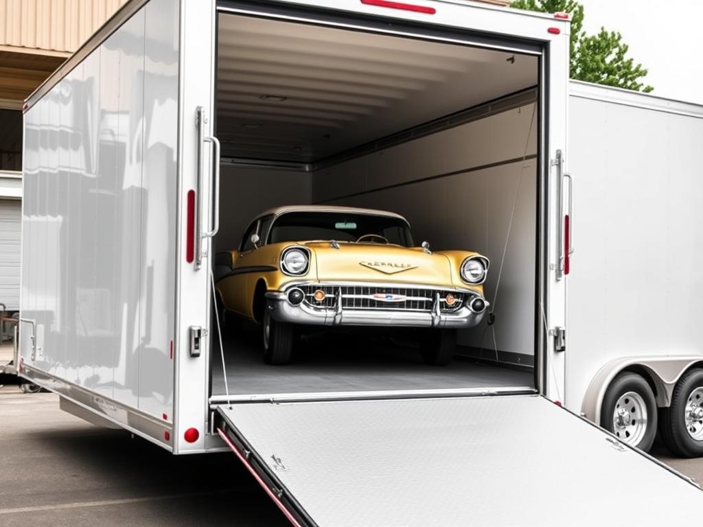 Enclosed trailer for classic car shipping with a vintage vehicle being loaded
