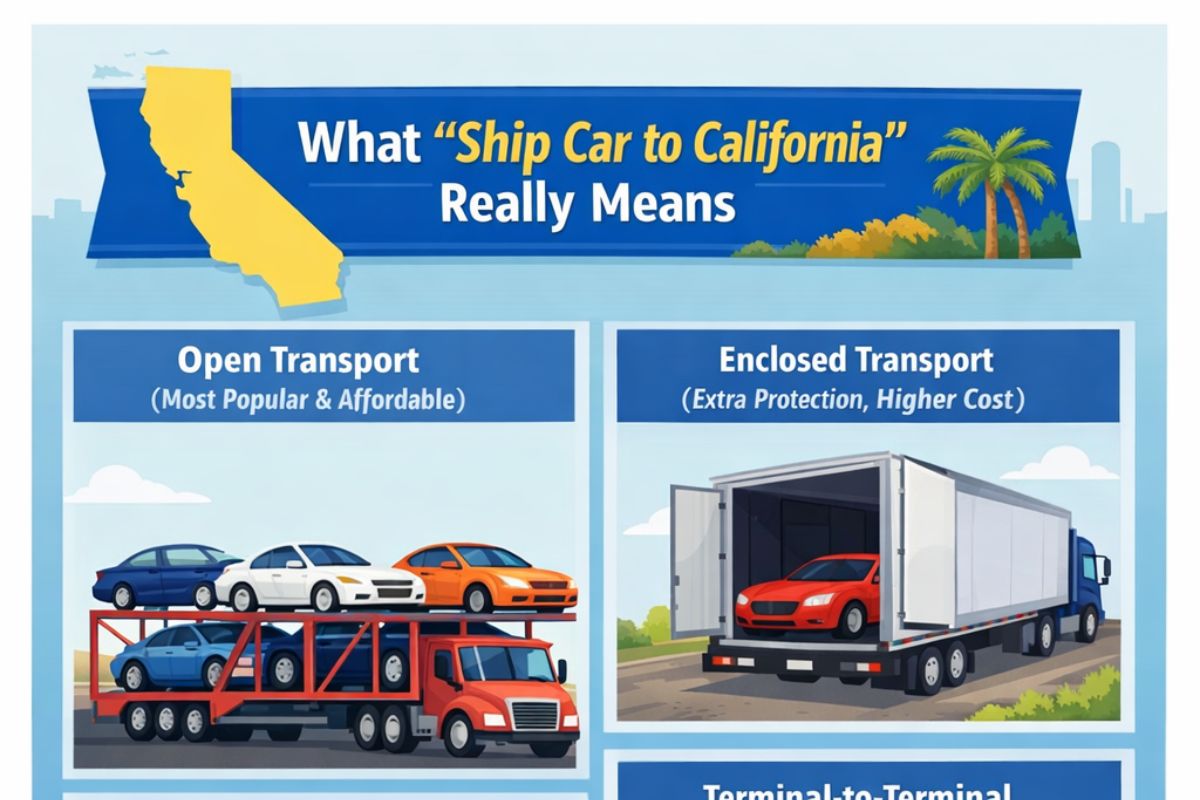When people say ship car to california, they usually mean professional auto transport—a licensed carrier moving your vehicle on a multi-car trailer. The most common variations you’ll see (and should understand) are:
